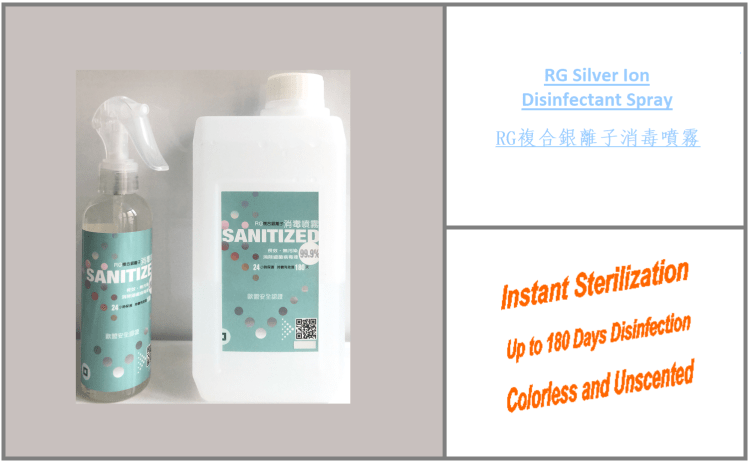RG Silver Ion Disinfectant is a sterilizing and disinfecting liquid formed by a combination of trivalent silver ions and strong alkaline (up to pH12) hydrogen-oxygen water by the scientific researchers of Richgate Technology for many years. This innovative product not only has the instant sterilization ability of hydrogen-oxygen water, but also the long-term disinfection effect of silver ions (effective up to 180 days). It also meets the safety standards of many countries. This product is colorless and unscented, and can be sprayed on various materials for disinfection purposes. It is effective to eliminate viruses (including coronavirus) and bacteria.